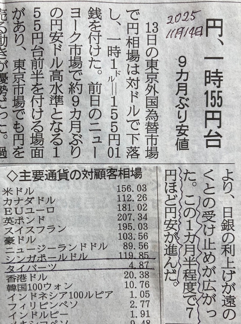上記の2025年11月14日付の新聞が伝えるように、9ヶ月ぶりの円安で、1バーツ=4.87円と、これまでの円安・バーツ高を更新。1万円で2,100バーツ未満のレートが当たり前になりつつある。